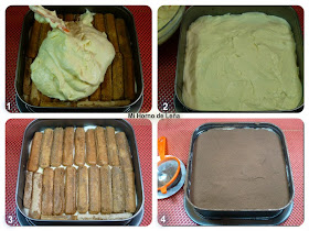 Colocamos en el molde (desmoldable) una capa de bizcochitos en el fondo y los mojamos muy bien de café. Ponemos la mitad de la mezcla de queso, la estendemos bien por toda la tarta.  Volvemos a cubrir con bizcochitos (en sentido contrario a los anteriores), esta vez empapados antes en el café.